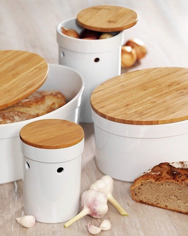• keramični kozarec, posebej primeren za shranjevanje česna – na enak način lahko shranjujete tudi drugo zelenjavo ali živila- pokrov iz bambusa – zaradi perforirane oblike se vlaga ne zadržuje v notranjosti in hrana …