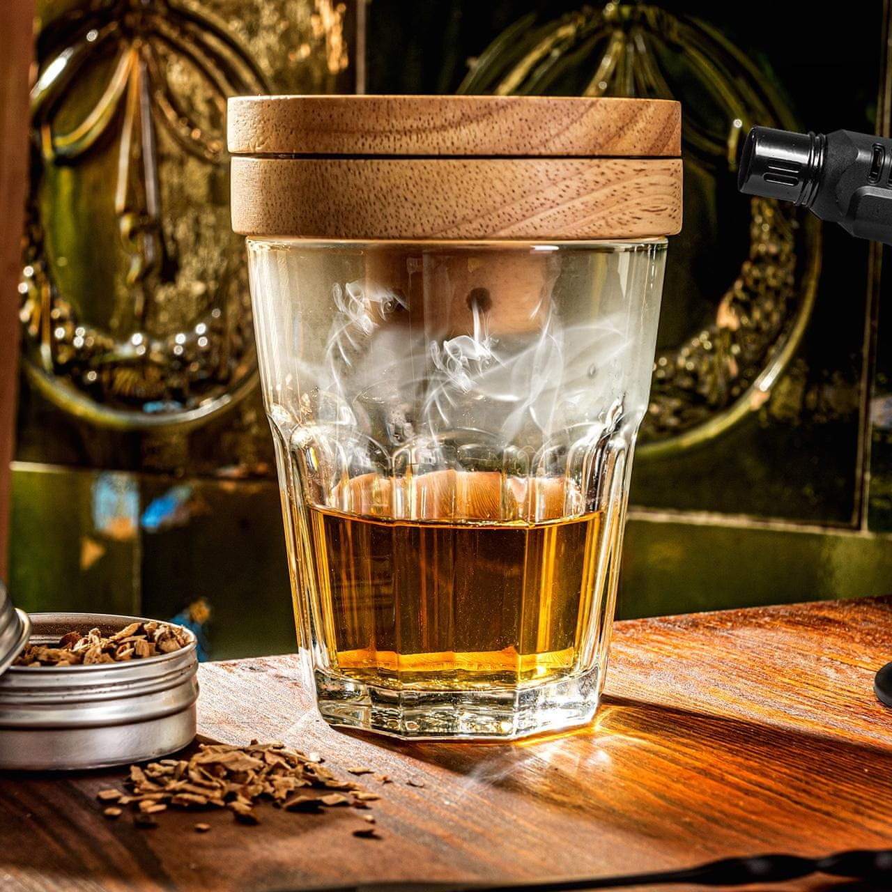 S tem elegantnim in praktičnim barmanskim kompletom spremenite svoj dom v profesionalni bar. Prijatelje in družino navdušite z domačimi pijačami ali koktajli, ki jim s kratkim in vizualno privlačnim postopkom dimljenja zagotovite edinstveno aromo in okus. Z dimljenjem v svoje najljubše žganje ali koktajl vnesete subtilno lesno noto. Aromatična nota po dimljenju je odvisna od vonja uporabljenih lesnih ostružkov; v našem kompletu boste našli ostružke z vonjem hrasta.