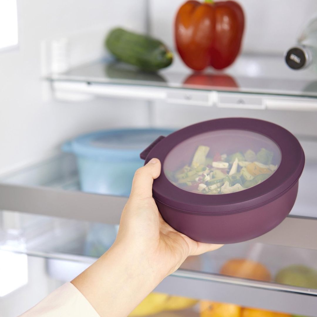 MEPAL CIRQULA (750 ml) – multifunkcionalna skleda s pokrovom v barvi sleza (bordo) je popolna za shranjevanje svežih živil ali že pripravljene hrane. Ta velikost je idealna za shranjevanje tako sveže zelenjave kot tiste že popečene na žaru. Linija »Cirqula« nizozemske blagovne znamke Mepal je zasnovana za popoln »krog uporabe« (ang. circle of use) – od shranjevanja živil v zmrzovalniku in hladilniku, segrevanja hrane v mikrovalovni pečici (brez pokrova), do serviranja neposredno na mizi. Cirqula je narejena iz neuničljivega materiala (brez BPA), prosojno okence na njenem pokrovu pa omogoča vpogled v shranjeno vsebino. Ravno ta inovativen, mehak pokrov omogoča zrakotesno in nepropustno zapiranje brez polivanja. Hrana bo dlje časa ohranjala svežino, skledico pa lahko vzamete tudi s seboj na pot. Mepal Cirqula posodice v različnih velikostih in oblikah so praktične in enostavne za shranjevanje, saj jih lahko postavite eno navrh druge, ko so polne, ali zložite skupaj, ko so prazne. Čiščenje posodic je enostavno, primerne so tudi za pomivalni stroj.