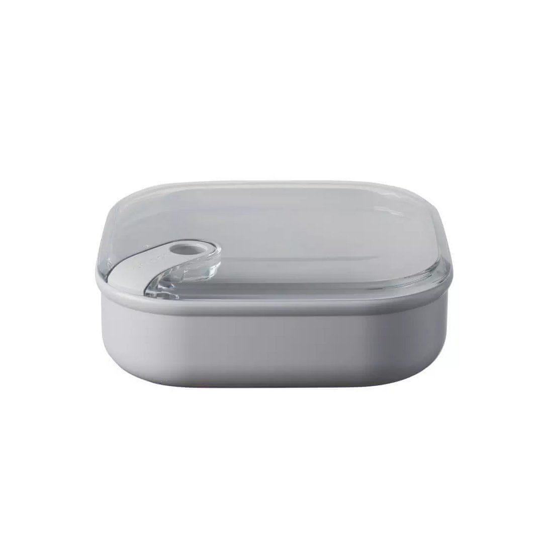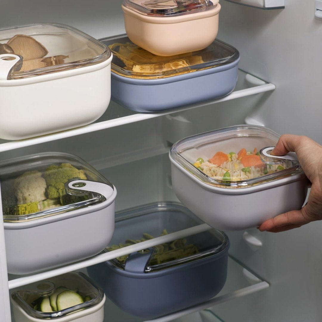Inovativna in patentirana hermetična nizka posoda Pull Box (1 l) je idealna za shranjevanje, prenašanje in pogrevanje živil. Patentiran sistem zapiranja ohranja svežino in zrakotesnost živil, preprečuje kapljanje ter ohranja trdno zapiranje kljub padcu ali nagnjenosti posode. Prav zaradi tega je posoda Pull Box enostavna za prenašanje v vrečkah oz. nahrbtnikih, kjer ni mogoče zagotoviti vodoravnega položaja posode. Eleganten dizajn s prozorno posodo je zasnovan za vse, ki so organizirani in imajo radi vse pod nazorom. Kvadratna oblika omogoča zasedenje celotnega razpoložljivega prostora, prozoren pokrov pa olajša prepoznavanje hrane v notranjosti, brez odpiranja posode. Pull Box združuje estetiko in funkcionalnost. Hermetično posodo lahko odprete z eno potezo. V njej boste zlahka prenašali vaše najljubše prigrizke v službo, šolo, na telovadbo, trening, piknik ali sestanek, ne da bi se pri tem odrekli vašim prehranjevalnim navadam. V njej lahko prenašate juhe, golaže, solate, sadje, prigrizke … Posoda je izdelana iz termoplastičnega materiala, ki ga je mogoče 100% reciklirati. Lahko jo uporabite v mikrovalovni pečici (brez pokrova), hladilniku in pomivalnem stroju (na vrhnji košari).