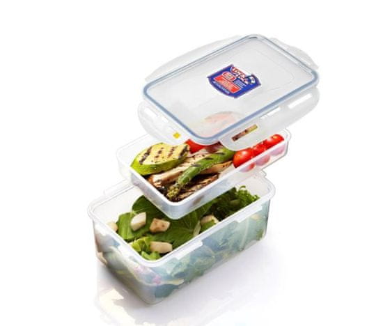 Škatla za hrano – s predalom v notranjosti, v katerem je mogoče ločiti živila. Posode Lock & Lock so varne in funkcionalne posode iz visokokakovostne plastike, ki je trpežna in vzdrži visoke temperature. Ti kozarci so 100-odstotno zrakotesni, kar zagotavlja dolgotrajno svežino shranjene hrane, odlični pa so tudi z vidika ohranjanja arome. Štiri premične „sponke“, ki pritrjujejo pokrov, so odporne na obrabo. Posode imajo posebej oblikovano zunanje dno, da jih je mogoče varno zlagati in da ne zdrsnejo. Posode Lock & Lock lahko uporabljate v hladilniku, mikrovalovni pečici, zamrzovalniku in pomivalnem stroju. Posode Lock & Lock so prestale stroge higienske teste in izpolnjujejo najstrožje predpise. Prostornina 1,4 l. Dimenzije – 20,5 × 13,4 × 8,4 cm. Barva prozorna.