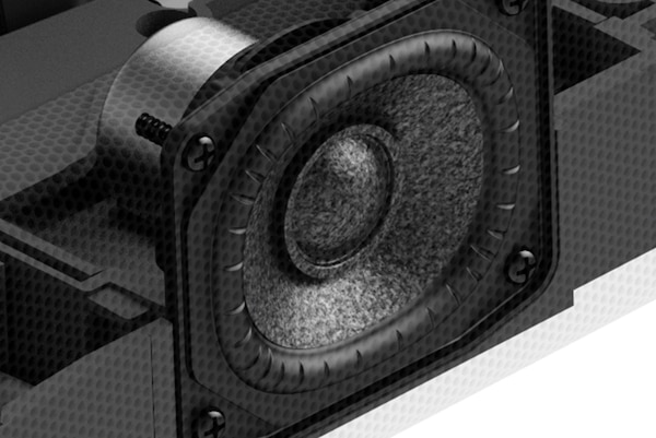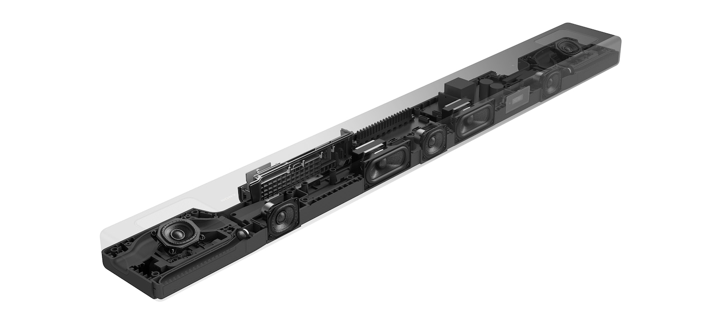 Sinhronizirano delovanje zmogljivih zvočnikov zagotavlja razločen in prostorski zvok, ki napolni sobo. Dva navzgor usmerjena zvočnika za zvok nad glavo, dva usmerjena visokotonca in trije sprednji zvočniki za prostorski zvok ter vgrajen globokotonec za globoke nizke tone.