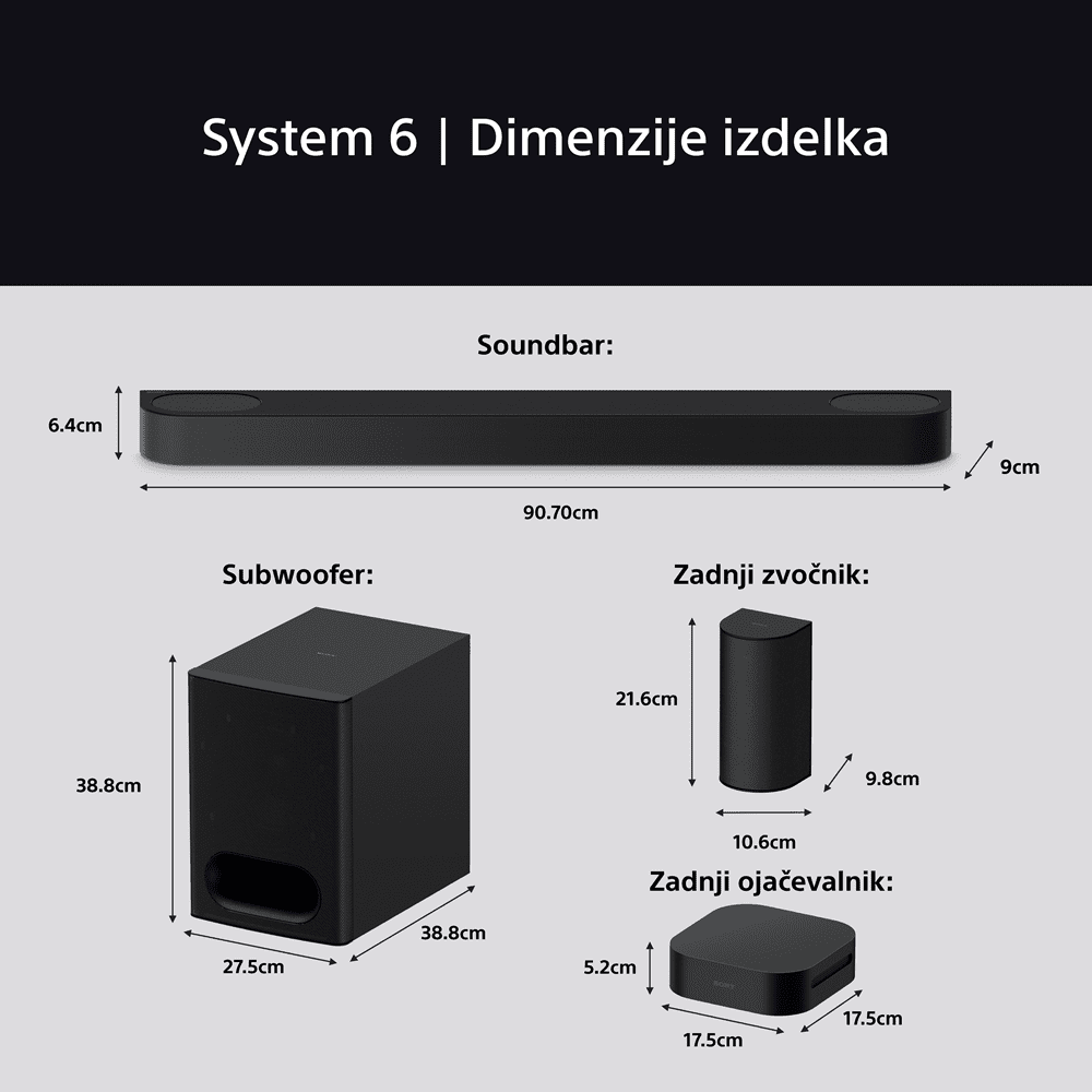 | Dimenzije, teža in ostalo | Velikost glavne enote – samo ohišje (Š x V x G): 907 × 64 × 90 mm Teža glavne enote – samo ohišje: 2,6 kg Velikost globokotonca: 275 × 388 × 388 mm Teža globokotonca: 11,6 kg Velikost zadnjega zvočnika (Š x V x G): 106 × 216 × 98 mm Teža zadnjega zvočnika: 0,89 kg Dimenzije ojačevalnika (Š X V X G): 175 × 52 × 175 mm Teža ojačevalnika: 0,76 kg Barva: črna |