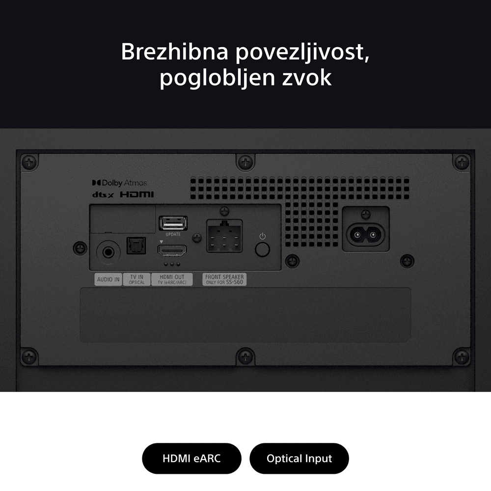 | Vmesnik | Vhodni in izhodni priključki: optični zvočni vhod, USB-A: Da (samo za posodobitev) Bluetooth®: Da (5.3) Podprti kodeki Bluetooth®: SBC, AAC |