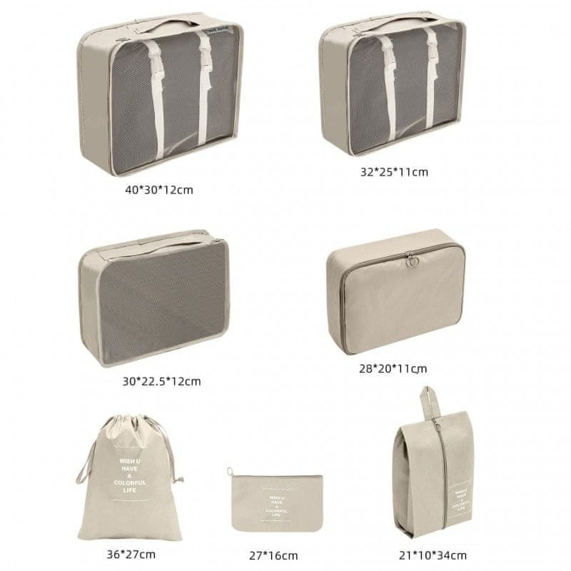 Praktični 7-delni komplet vključuje različne velikosti torb in organizatorjev – od majhnih kozmetičnih torbic, preko srednje velikih kovčkov do večjih torb za oblačila ali obutev. Kombinacija gladke tkanine in prosojnih mrežastih plošč omogoča hitro orientacijo v stvareh. Vsi kosi imajo zadrge in praktične ročaje, tako da jih lahko enostavno pospravite v kovček ali nahrbtnik in učinkovito organizirate notranji prostor.