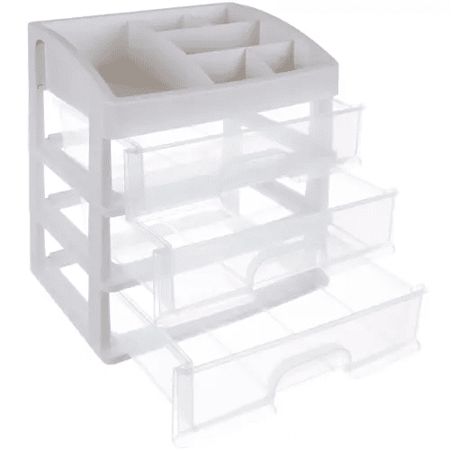 UNIVERZALNI ORGANIZATOR ZA KOZMETIKO IN DROBNE STVARI ponuja učinkovito rešitev za ohranjanje reda v vašem prostoru. Ima 3 prozorne predale, ki vam omogočajo hitro in enostavno iskanje vseh potrebnih predmetov, ter zgornji del s 6 različnimi predelki, ki vam nudi fleksibilnost za organizacijo kozmetike, nakita ali pisarniškega materiala. Narejen je iz kakovostne plastike in meri 27 × 23,5 × 17 cm, kar ga naredi idealno izbiro za kuhinjo, kopalnico ali druge prostore.