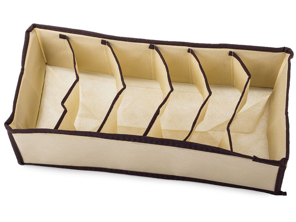 Organizator za predal ozki s 6 razdelki v bež barvi z rjavo obrobo za shranjevanje nogavic, spodnjega perila in raznih malenkosti. Celoten opis