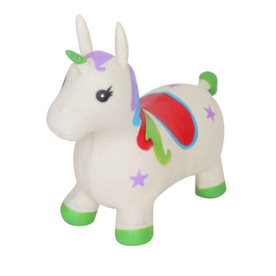 Vrsta: igrače za skakanje. V kompletu: 1 napihljivi enorožec za skakanje. Značilnosti: krepi mišice celega telesa, učenje vzdrževanja ravnotežja, ušesa za trden oprijem otroka. Priporočena starost: 3+.