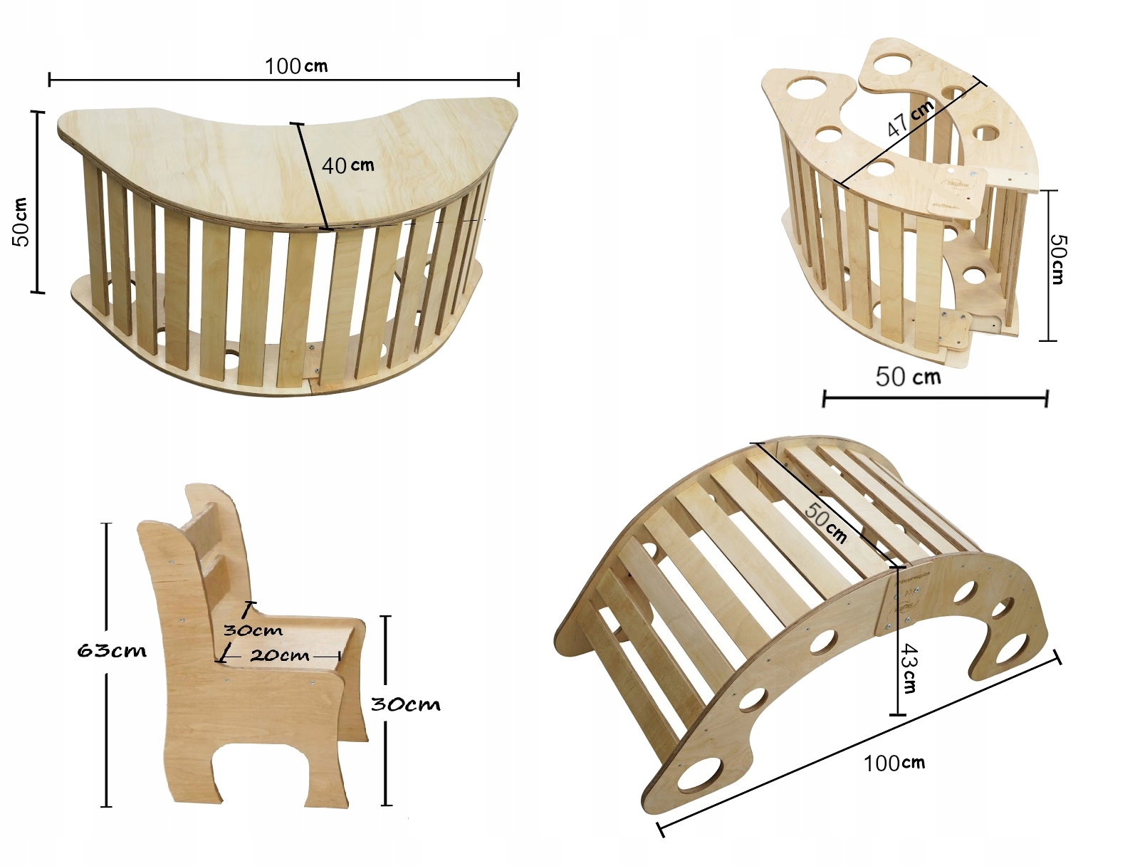 Večnamenski lesen gugalnik velikosti L z zgornjo ploščo in Montessori stolčkom za najmlajše