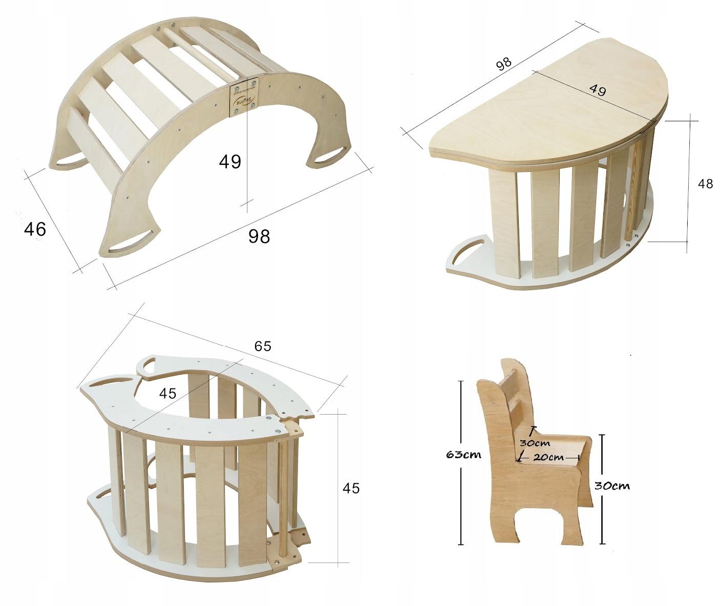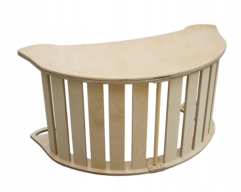 Večnamenski zložljivi leseni gugalnik L z zgornjo ploščo in Montessori stolčkom za najmlajše