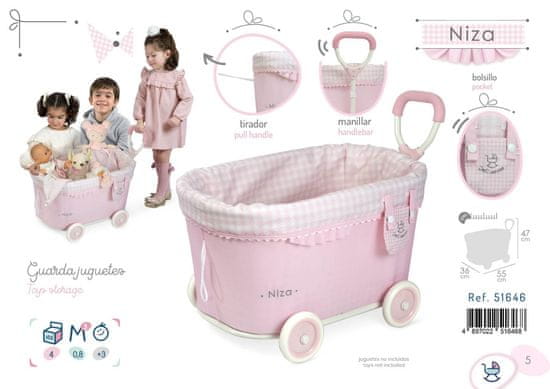 DeCuevas 51646 NIZA 2022 mobilna škatla za shranjevanje igrač z ročajem je popolnoma nov izdelek te španske blagovne znamke in spada v istoimensko mehko roza kolekcijo NIZA, ki je nova za leto 2022 in poleg različnih vozičkov ponuja tudi pohištvo za punčke in majhne punčke. Kolekcija je izdelana iz enobarvnega roza materiala v kombinaciji z roza in belimi drobnimi bloki, okrašenimi z roza obrobami ter belimi in roza drobnimi in večjimi volančki. Vse je videti zelo lahkotno in čisto.