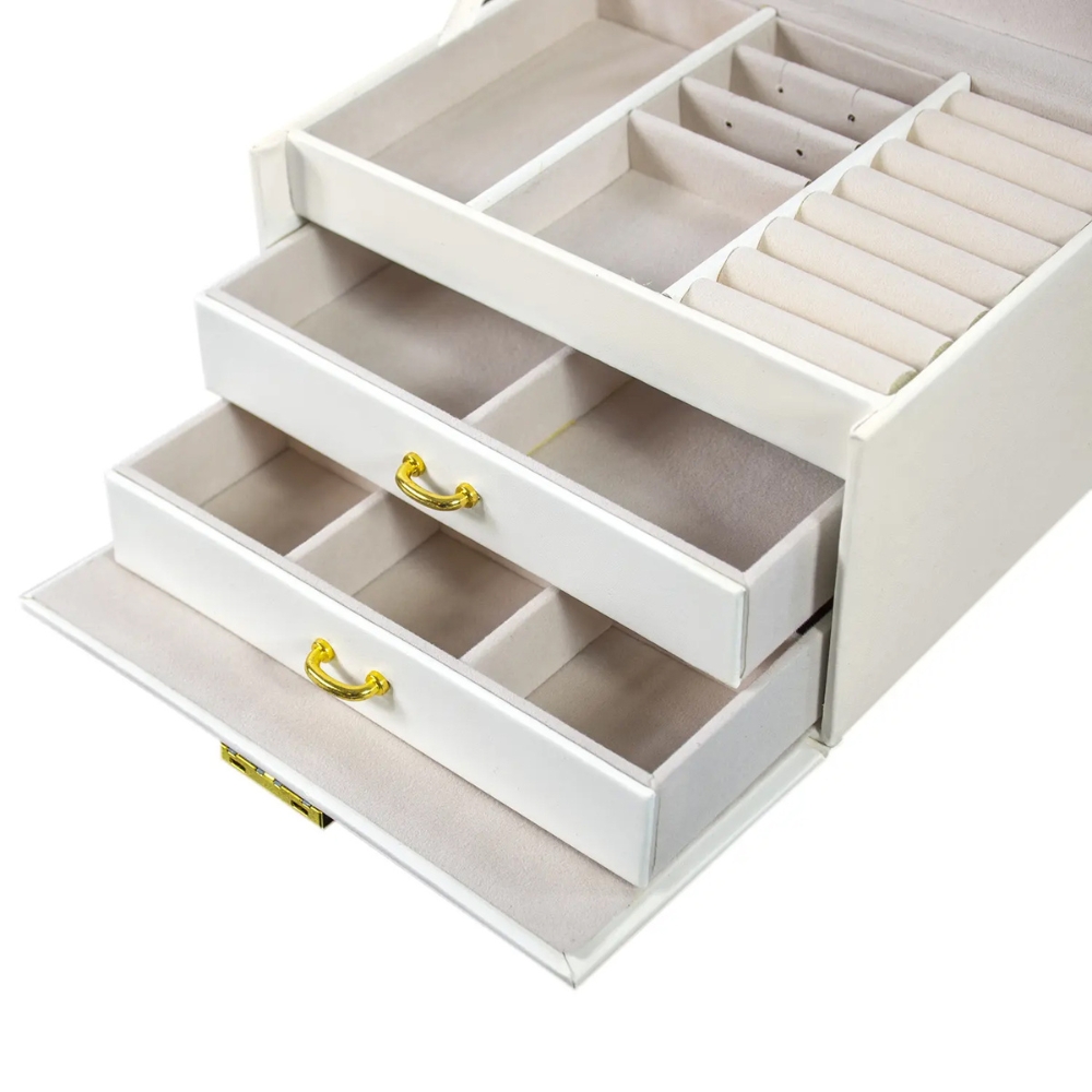 elegance in praktičnosti. Izdelana je iz visokokakovostnih materialov , odlikuje jo vzdržljivost in skrbna izdelava. Njena minimalistična bela barva se podata v vsako notranjost in ji doda subtilen čar. To je popolno darilo za babico, mamo ali deklico, , ki začenja svojo pustolovščino z nakitom, bo navdušilo vsako damo s svojim klasičnim videzom in funkcionalnostjo. ⭐️ORGANIZACIJSKA POPOLNOST – ŠKATLA S PREDALCI ⭐️ Organizacijski predali: