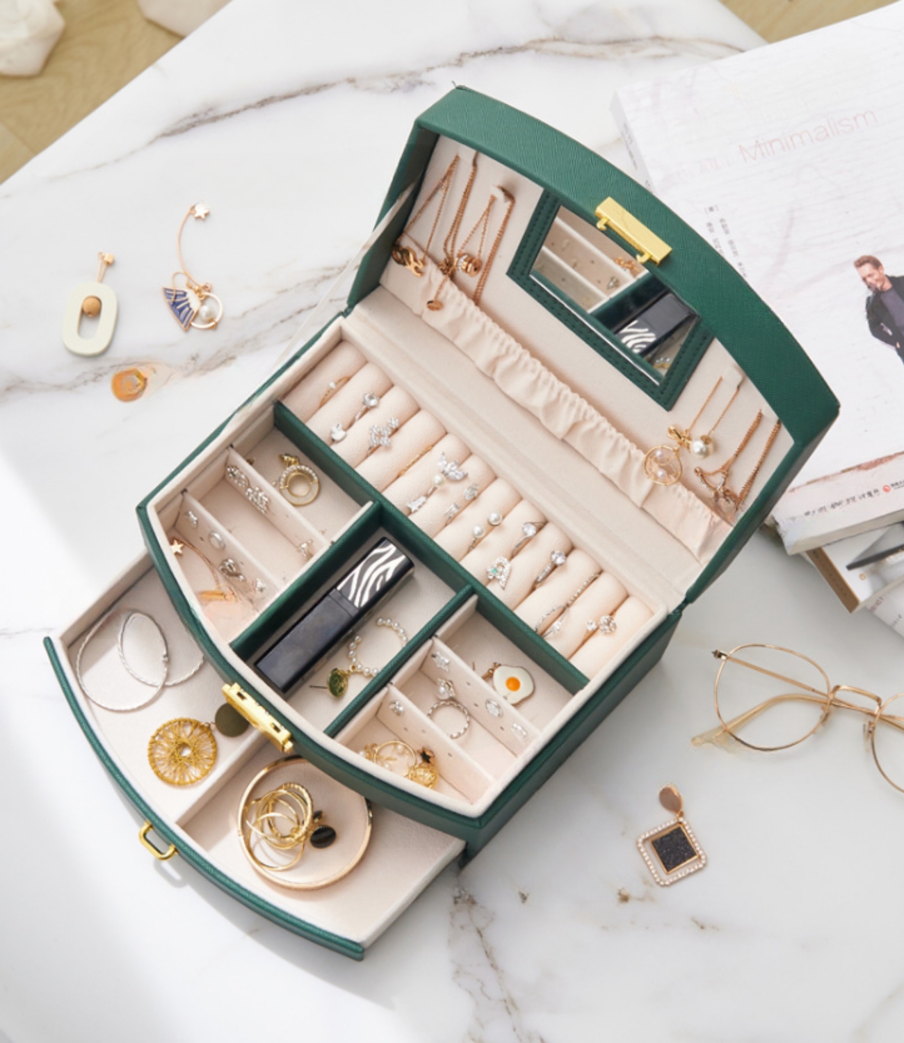 1️⃣ zgornja raven ima dolg žep s mesti za prstane, dva predala za uhane z odstranljivimi ločili, kjer boste našli prostor za 14 parov uhanov in predal za manjše predmete