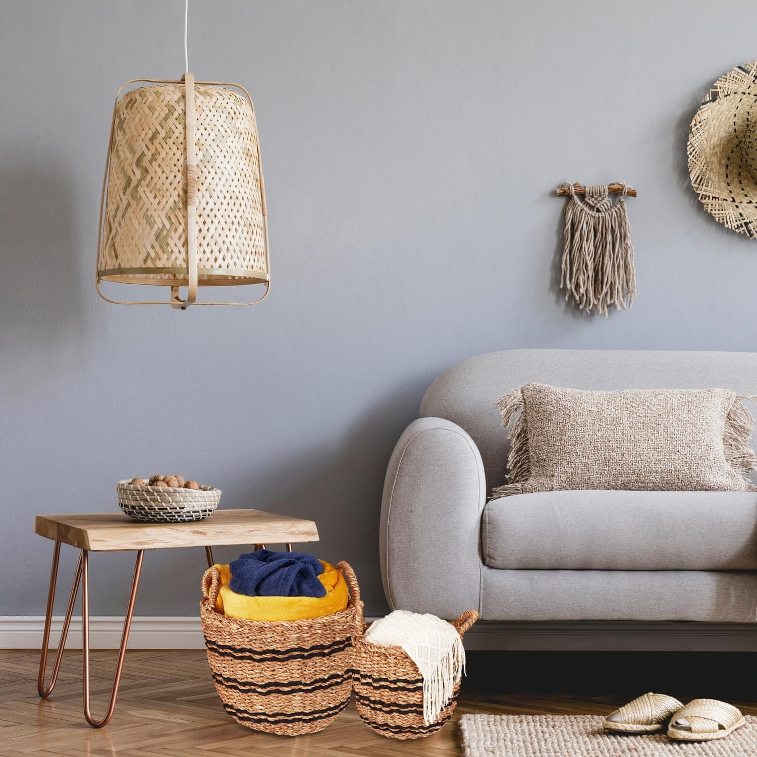 Povečajte svoje shranjevanje in stil s tem kompletom 3 okrasnih košar iz ratana s poudarki iz jute. Popolne za urejeno shranjevanje kopalniških pripomočkov, brisač, odej in majhnih predmetov, te košare v boho slogu so tako praktične kot tudi estetsko prijetne. Pletene košare za shranjevanje so opremljene z dvema integriranima ročajema za enostaven transport in jih lahko uporabljate v dnevni sobi, kopalnici ali spalnici. Po potrebi lahko košare tudi zložite eno na drugo, da prihranite prostor. S temi vsestranskimi košarami iz ratana ustvarite odlično pašo za oči in ohranite dom urejen.