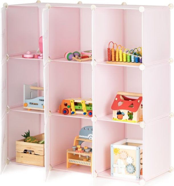 Modularna omarica je sestavljena iz 9 polic (predelkov), ki jih lahko poljubno razporedite in tako pohištvo prilagodite otrokovim individualnim potrebam in željam, lahka konstrukcija iz trpežnih polipropilenskih (ABS) plošč, ki so za dodatno trdnost in stabilnost ojačane s kovinskim okvirjem, vsaka polica prenese do 3 kg tovora, zato je idealen prostor za knjige, plišaste igrače ali kocke, mere omare: 109 × 109 × 37 cm, višina enega oddelka: 35 cm.