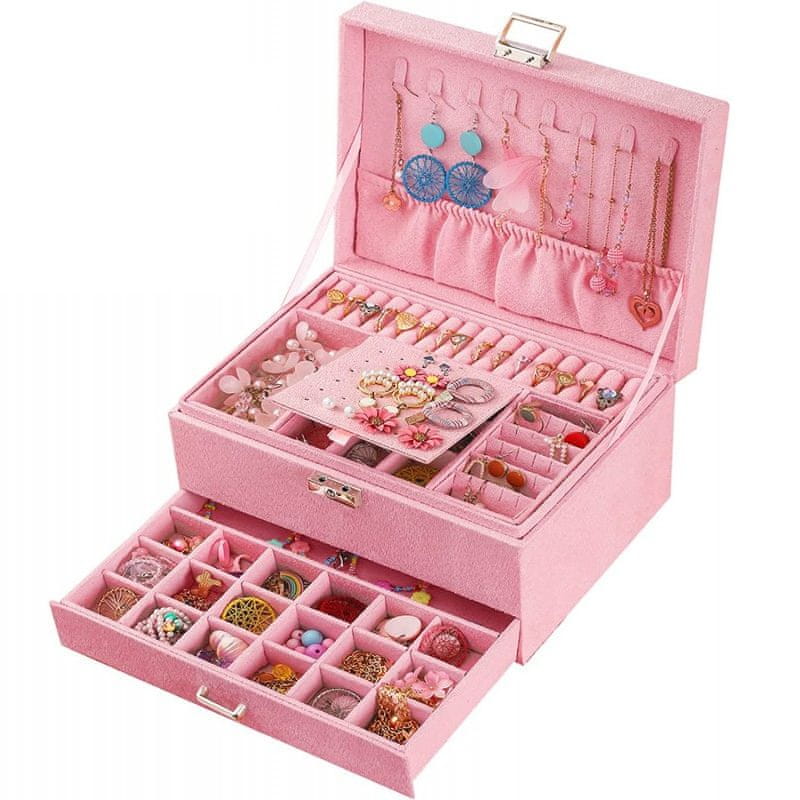 Škatla za nakit – praktični predelki za prstane, uhane, zapestnice in verižice, trdna kovinska ključavnica, eleganten semiš material, zunanje mere: 24 × 11,5 × 17 cm. Celoten opis