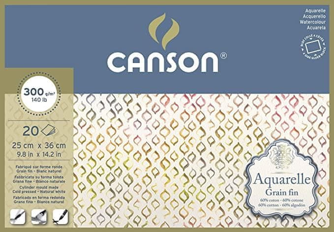 Aquarelle Canson je akvarelni papir, izdelan na stroju z valjčnimi kalupi po tradicionalnem postopku izdelovalcev papirja. Vsebuje 60 % bombaža, materiali pa so skrbno izbrani, da temu papirju dajo sloves odličnosti. Brez kislin, brez optičnih belil in alkalnih puferjev, je ta izjemen papir zasnovan tako, da zagotavlja odlično ohranjanje skozi čas. Tekstura je čutna na dotik in v kombinaciji s toplo belo barvo prinaša kontrast in perspektivo vašim umetniškim delom.