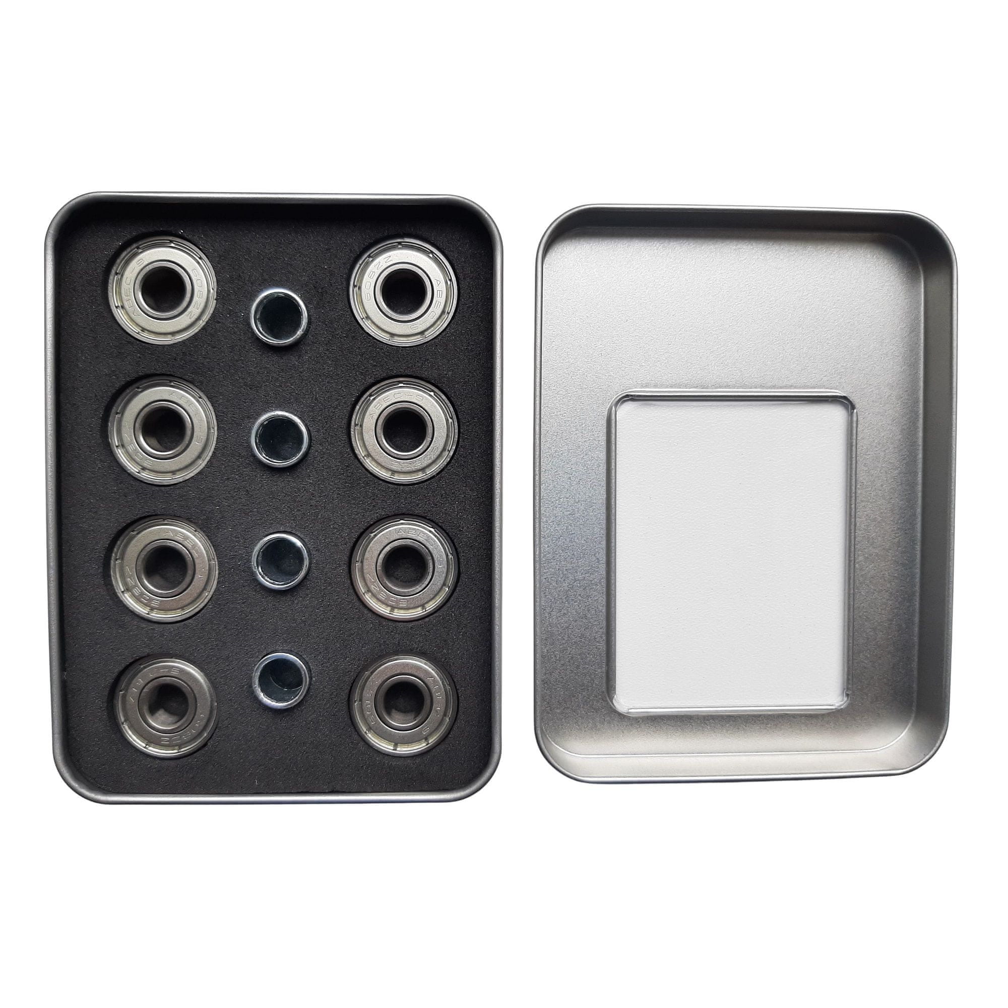 Komplet nadomestnih ležajev ABEC 9 za rolke v luksuzni kovinski škatli. Paket vsebuje 8 kosov ležajev ABEC 9 in 4 kose distančnih puš.