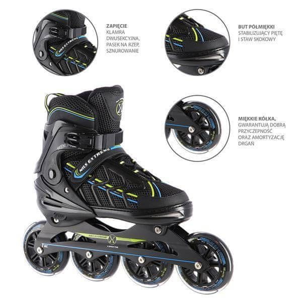 Model NA1128 Nils Extreme je model rolerjev, zasnovan za srednje napredne in strastne drsalce. Združuje privlačen dizajn z najkakovostnejšimi materiali, kar zagotavlja izjemno udobje. Čevelj je izdelan iz EVA, žameta in mrežice, kar zagotavlja izjemno udobje med drsanjem. Poleg tega je čevelj zračen. Ležaji ABEC7 zagotavljajo visokokakovosten oprijem. Mehka kolesa zagotavljajo dober oprijem in dobro absorbirajo vibracije. Njihov velik premer omogoča tudi visoke hitrosti. Zapenjanje škornja z dvodelno zaponko, ježkom in vezalkami zagotavlja maksimalno varnost med drsanjem. Funkcija nastavitve velikosti omogoča hitro prilagoditev uporabnikovemu stopalu, kar zagotavlja, da bodo ti rolerji zdržali več sezon! Specifikacije: Okvir rolerjev: aluminij Ležaji: ABEC7 Škornji: polmehki s prezračevalnim sistemom Material: Žametna mreža EVA Kolesa: PU72 mm/82A (M 35–38) PU84 mm/82A (L 39–42) PU100 mm/82A (XL 43–45) Zapenjanje: Dvodelna zaponka z ježkom Vezalke Notranja dolžina škornja: 279–301 mm Opombe: Ni namenjeno za komercialno uporabo V skladu s standardom PN-EN 13843:2009 24-mesečna garancija