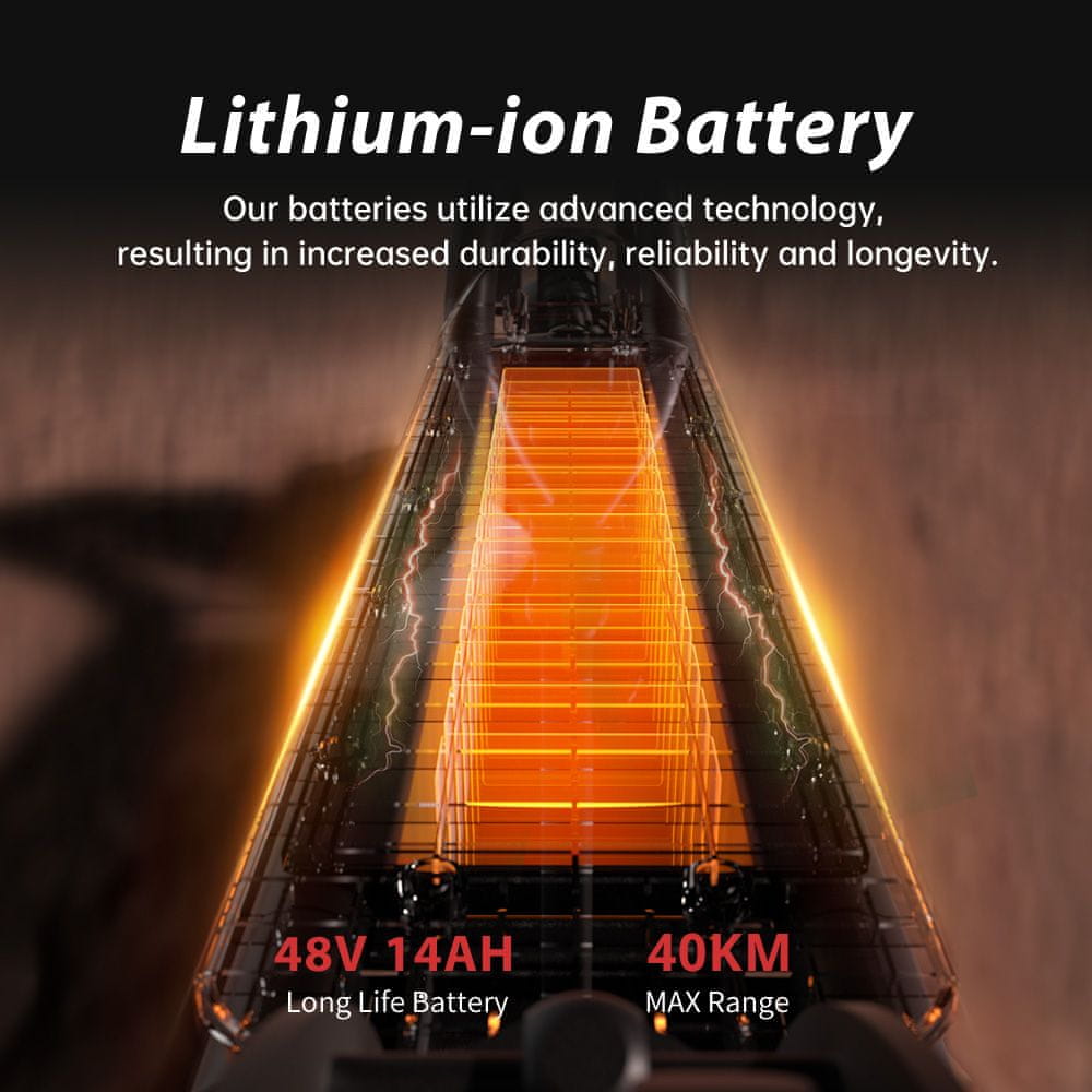 Baterija z napetostjo 48 V in kapaciteto 14 Ah omogoča doseg do 45 km na enem polnjenju. To zadostuje za večino dnevnih poti in zmanjšuje pogostost polnjenja