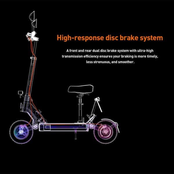 Lastniški sistem vzmetenja deluje z 10-palčnimi terenskimi pnevmatikami za absorbiranje vibracij s ceste, medtem ko zložljiv sedež zagotavlja dodatno udobje sedenja. Ta kombinacija obravnava tako blaženje vibracij kot tudi prilagodljivost drže med vožnjo.