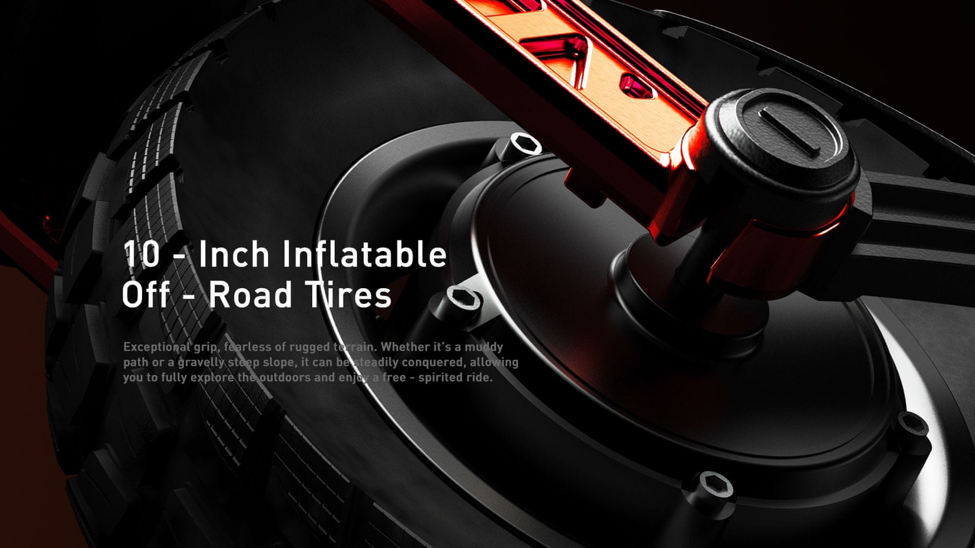 The 10-inch pneumatic off-road tires offer excellent shock absorption and superior traction on various surfaces, including uneven city streets and light off-road paths. These tires enhance overall ride comfort and stability.