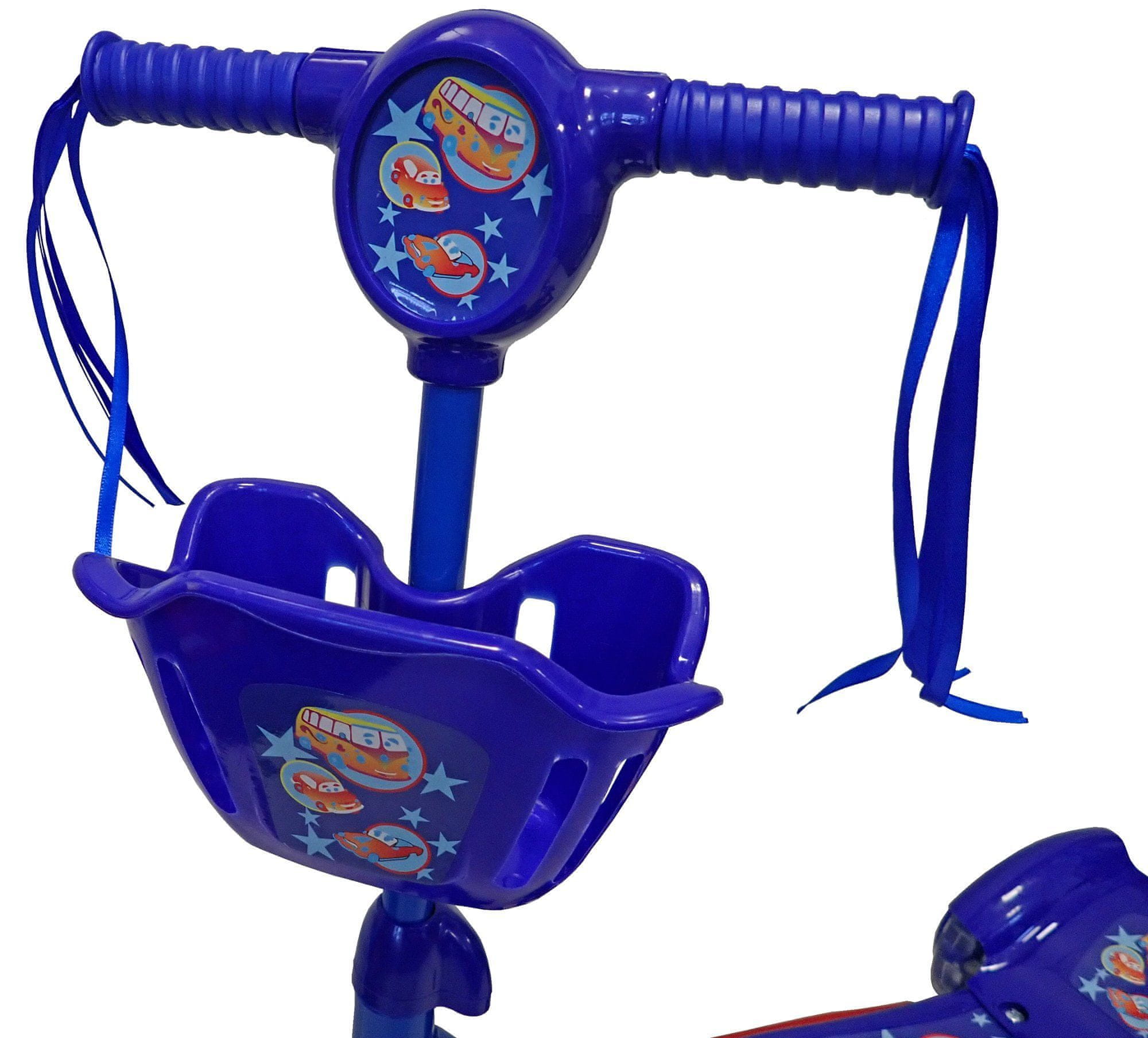 Ta skuter je idealen za majhne otroke med 2. in 3. letom starosti, saj v svoji konstrukciji združuje jeklo in plastiko. Opremljen je s plastičnimi kolesi s premerom 15 cm spredaj in 11 cm zadaj. Celotne mere skuterja so 54 cm v dolžino, 21 cm v širino in 58 cm v višino. Podstavek za noge, namenjen namestitvi nog, je dolg 24 cm. Ta model tehta 2,1 kg in lahko nosi do 30 kg tovora. 3 x baterije AA niso priložene. Skuter je na voljo v modri barvi.