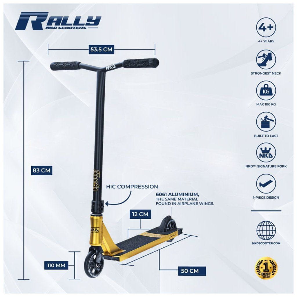 NKD Rally V4 je freestyle koloběžka, která je určena pro středně pokročilé jezdce a vede si dobře na ulicích i ve skate parku!