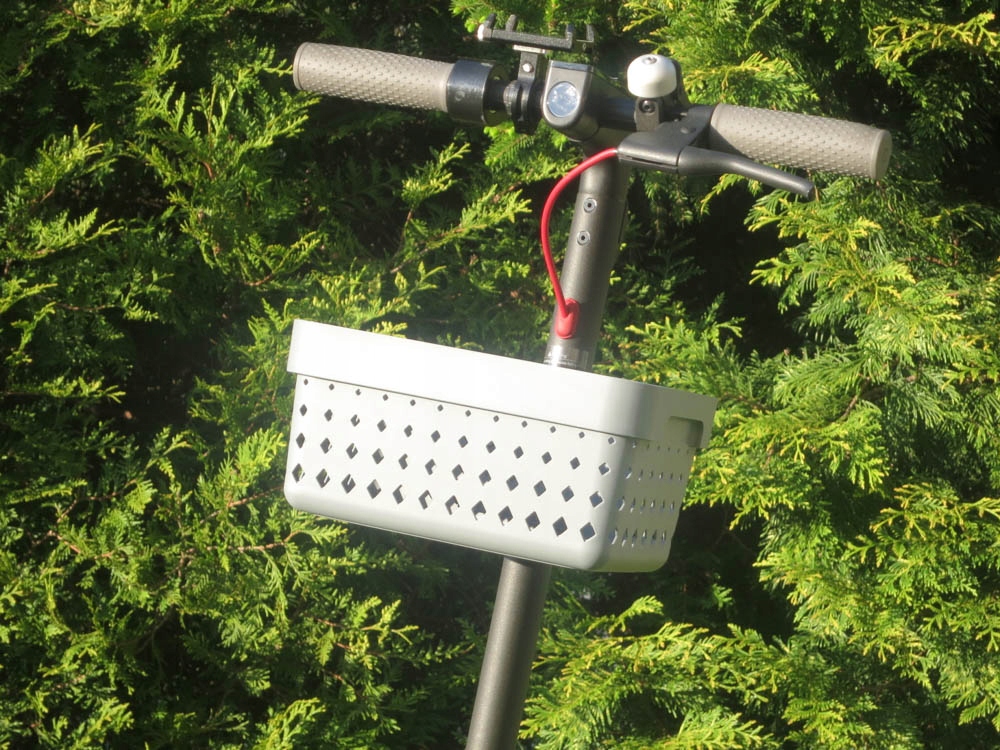 V galeriji izdelkov predstavljamo primer košare, nameščene na drug skuter, medtem ko je košara, ki se prodaja v tej ponudbi, prilagojena skuterju DUALTRON VICTOR, velikost sponk pa je prilagojena skuterju DUALTRON VICTOR