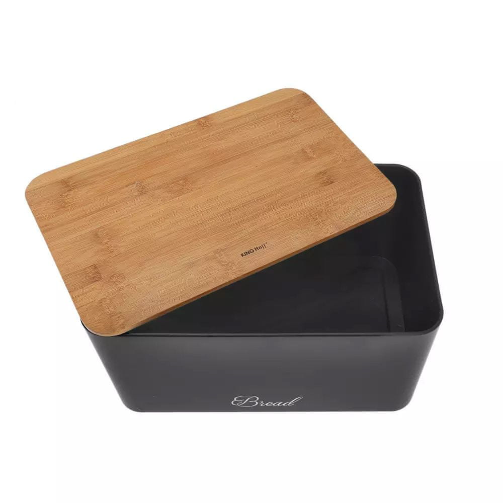Skrinja za kruh iz ogljikovega jekla s črno emajlirano prevleko + komplet 3 posod za kavo, čaj in sladkor. Mat površina – Uporabljeni materiali so ekološki in higienski – Pokrov iz lesa bambusa – lahko se uporablja kot deska za rezanje – Lahka in trpežna konstrukcija – Privlačen, sodoben dizajn – Primeren za shranjevanje vseh vrst kruha in peciva – Velikost: 35 × 23 × 18,5 cm – Velikost posode: 11,5 × 11,5 × 12,3 cm – Embalaža: barvna kartonska škatla