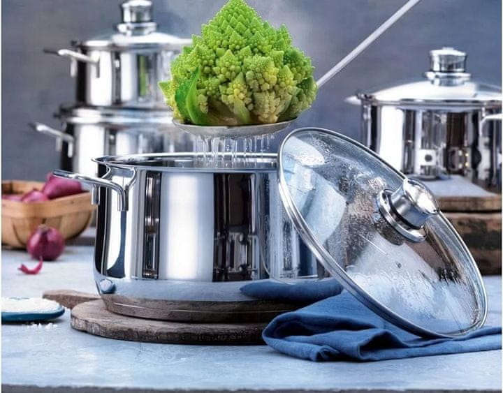 Kolekcija Diadem Plus podjetja WMF je odlična ponudba za vse, ki cenijo udobje in funkcionalnost v kuhinji. Lonci v tej seriji so zasnovani z mislijo na enostavno uporabo in zanesljivo vzdržljivost za dolga leta. Ne glede na to, ali kuhate zase ali za vso družino, jih njihova elegantna zasnova in subtilno zaobljena oblika naredita popoln dodatek k vsaki kuhinji. Natančen nadzor temperature vam omogoča kuhanje pri nižjih stopnjah moči in s tem varčevanje z energijo. Poleg tega vam toplotno odporni stekleni pokrov omogoča spremljanje kuhanja, ne da bi ga morali dvigniti.