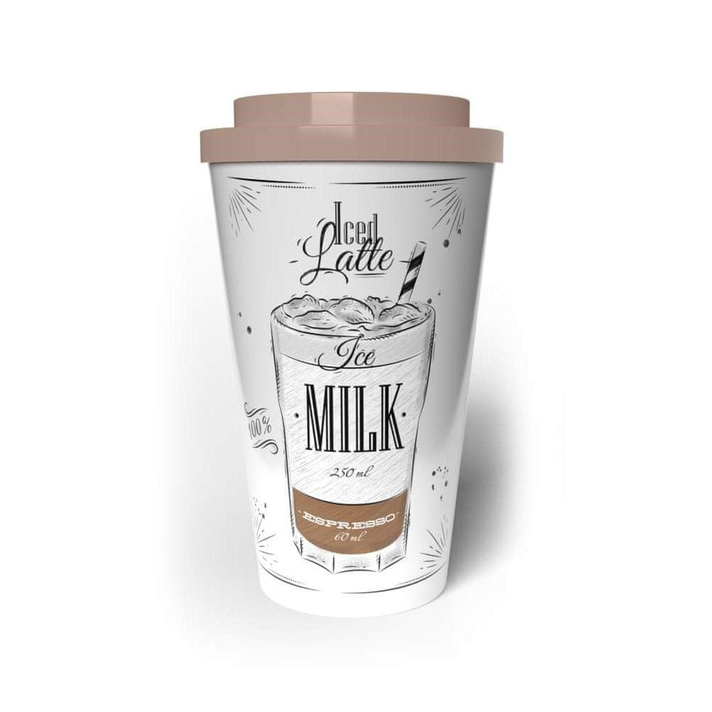 Potovalna dvostenska plastična skodelica COFFEE z dekoracijo Iced latte s prostornino 500 ml, primerna za tople in hladne pijače. Vrč ni namenjen za pijače s temperaturo, višjo od 60 stopinj Celzija. C. Zaradi dvojne stene dlje časa ohranja želeno temperaturo pijače. Vrč je v celoti iz plastike – telo vrča je izdelano iz PS, pokrovček je izdelan iz PP s silikonskim tesnilom, izliv je izdelan iz AS. Skodelice ni mogoče pomivati v pomivalnem stroju.