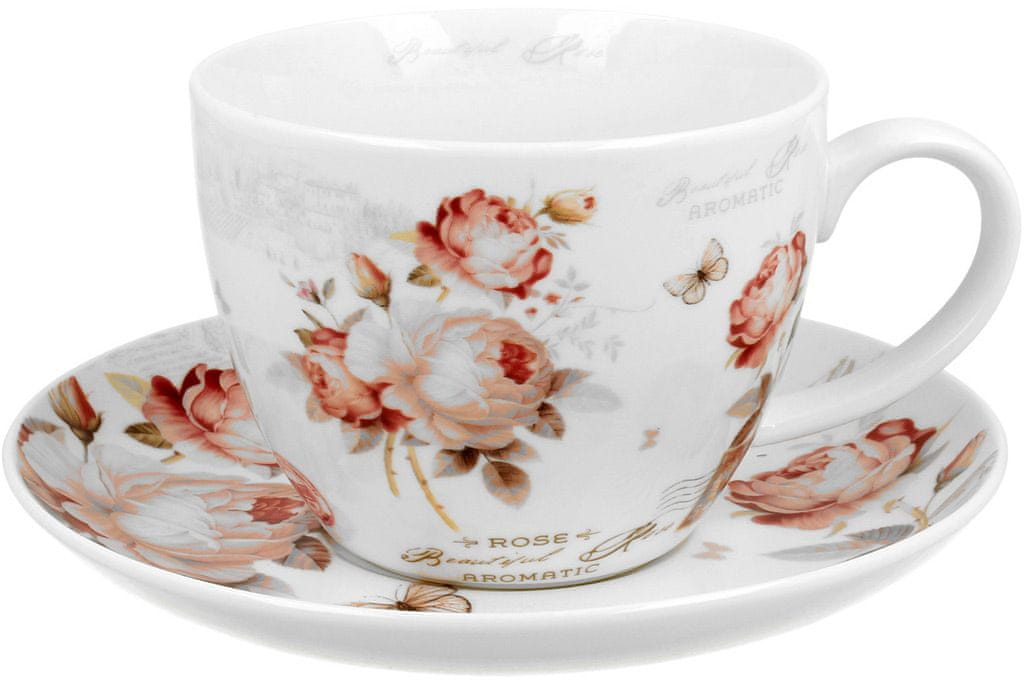 Eleganten komplet velike skodelice in krožnička. Prikupni cvetni motiv Vrtnica. Porcelan, 470 ml. Lična embalaža, nadvse primerna za darilo. Celoten opis