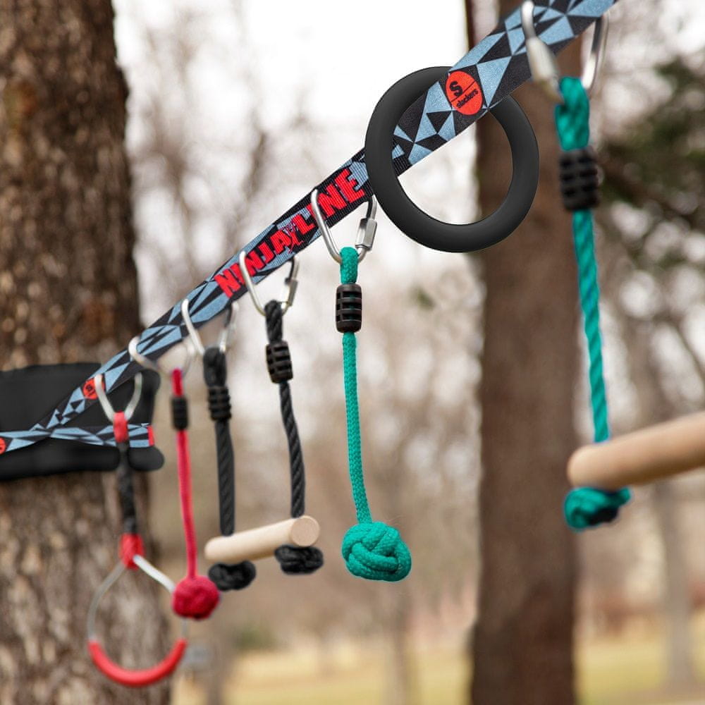 Priljubljena linija SLACKERS Ninja Line v novem dizajnu in z novimi ovirami! 11 m dolg trak Ninja (uporabna dolžina približno 9 m), širok 5 cm, z všitimi zankami za pritrjevanje ovir in plezanje po ročajih. Komplet vključuje tudi trpežno kovinsko ročico s plastičnim ročajem in všito zanko, vse v trpežni torbi za prenašanje. V vrv je všitih 14 zank za sidranje ročajev in ovir z varnostnimi kovinskimi delta karabini. Komplet vključuje skupaj 2 gimnastična obroča, 2 opičji gugalnici, 2 opičji pesti in 1 obroč trapeza. Osnovni trak/vrv Ninja se lahko uporablja tudi kot klasična vrv slackline. Vse je pakirano v škatli, vključno s priročno vrečko, opisom in navodili.