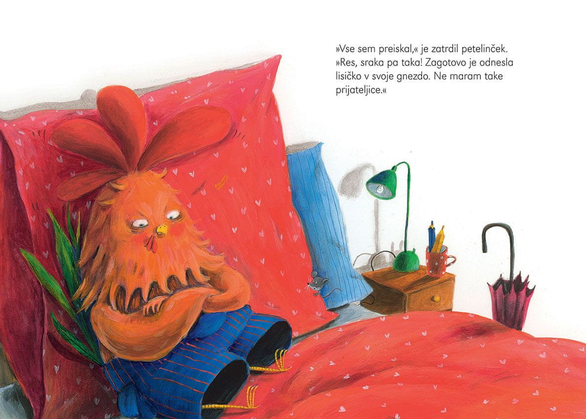 Sraka ga užaloščena zapusti. Petelinček se želi potolažiti s svojima igračama – miško in lisičko. A za še dodatno nesrečo, svoje ljube lisičke nikjer ne najde. Vsi v kurniku potem glasno pametujejo, kako so svarili, da je sraka pač tatica. Petelinček je šokiran. Pred večernim branjem z mamo v postelji pa je že prepričano jezen na svojo nekdanjo prijateljico. Potem pa mama mimogrede za posteljnim robom najde pogrešano igračo. Petelinček po razburljivem dnevu vendarle sladko zaspi s svojima igračama v tesnem objemu.