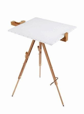 Predstavitveni letak – Izdelano iz naoljenega bukovega lesa, odpornega na madeže – Premakljiv del, kjer vpnemo platno, je mogoče prilagoditi na poljuben kot med navpičnim in vodoravnim položajem – primerno torej tudi za slikanje z akvareli. Celoten opis