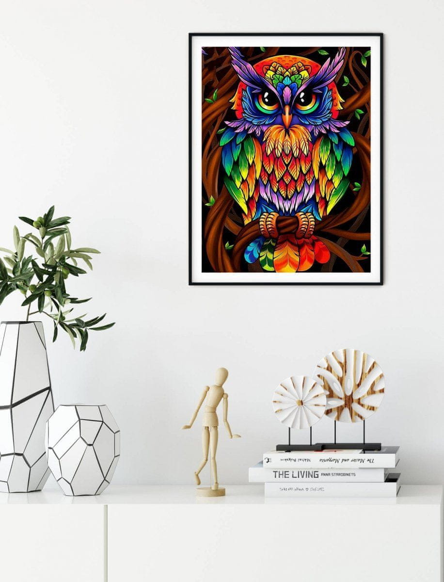 Kompleti za diamantno vezenje z živalskimi motivi so priljubljeni zaradi vsestranskosti takšnih grafik. Ta izdelek je enostaven za sestavo, sam proces pa pogosto opisujejo kot sproščujoč. Sova, upodobljena na sliki, izstopa po bogati barvni paleti in zanimivem, modernem oblikovanju. Zaradi tega je osupljiv dodatek k steni. Zaradi svoje majhnosti bo vezenina služila kot subtilen okrasni dodatek.