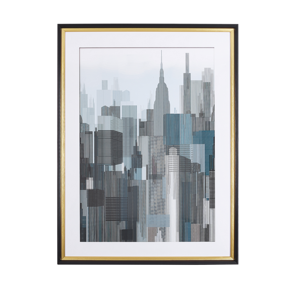S to minimalistično sliko vnesite v svojo dnevno sobo občutek velikega mesta. Vitki nebotičniki iz tankih črt v številnih odtenkih sive in modre barve so navdihnjeni z oblikovanjem črtnih kod in ustvarjajo 3D učinek, ki je poudarjen s paspustom ter zlatim in črnim tankim okvirjem. Uokvirjen plakat ima na hrbtni strani dve kljukici, zato ga lahko takoj po odpremi iz škatle hitro obesite na steno.