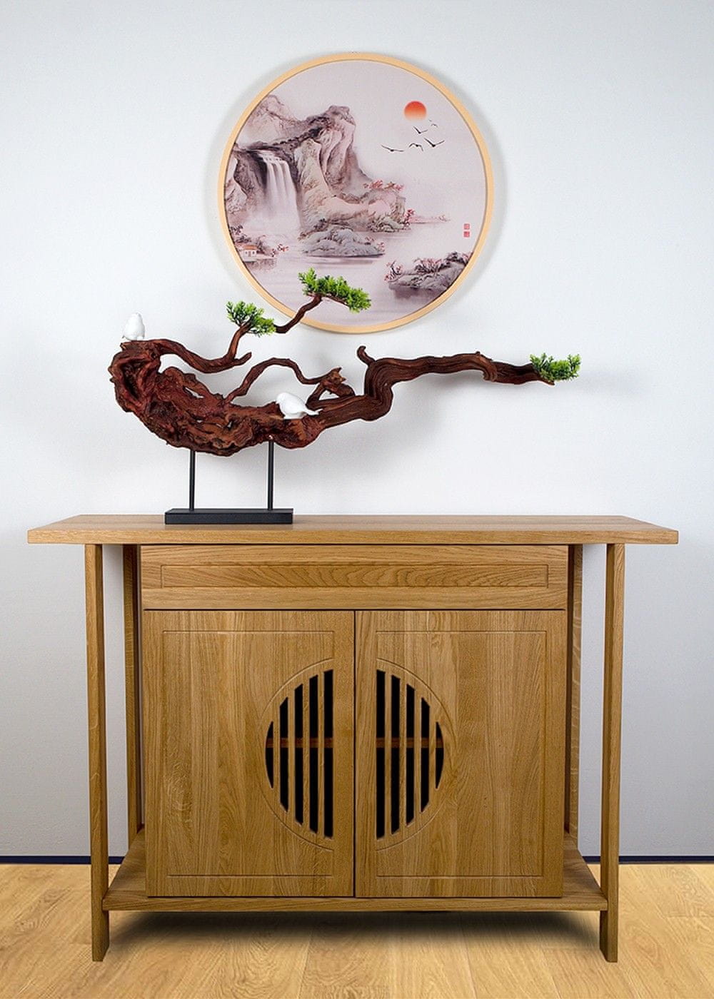 Okrogla slika v lesenem okvirju bo v vaš interier vnesla košček Azije preteklih stoletij. Tematsko izhaja iz starih kitajskih akvarelnih in črnilnih slik na riževem papirju. Tako kot bonsaji si slike ohranjajo globoko povezanost z naravo in živalmi, ki so obdajale stare mojstre in jih navdihovale. Visoka gorovja, prostrana jezera, cvetoča drevesa, megličasti prameni – detajli iz vsakdanjega življenja, ujeti v trenutku s svojo očarljivo magijo. Danes se ti motivi prenašajo s tiskom na platno in lahko tako dopolnijo tudi vaš dom.