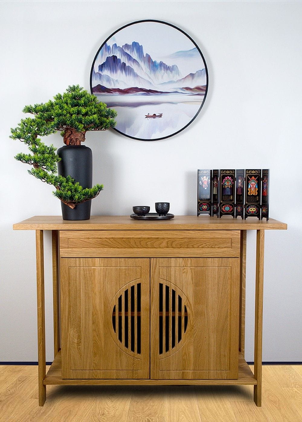 Okrogla slika v kovinskem okvirju bo v vaš interier vnesla košček Azije preteklih stoletij. Tematsko izhaja iz starih kitajskih akvarelnih in črnilnih slik na riževem papirju. Tako kot bonsaji si slike ohranjajo globoko povezanost z naravo in živalmi, ki so obdajale stare mojstre in jih navdihovale. Visoka gorovja, prostrana jezera, cvetoča drevesa, megličasti prameni – detajli iz vsakdanjega življenja, ujeti v trenutku s svojo očarljivo magijo. Danes se ti motivi prenašajo s tiskom na platno in lahko tako dopolnijo tudi vaš dom.
