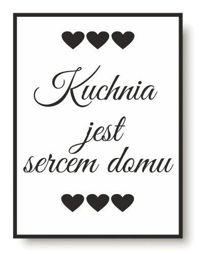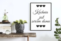 Uokvirjen plakat. Črno bel napis za kuhinjsko steno. Kuhinja je srce…