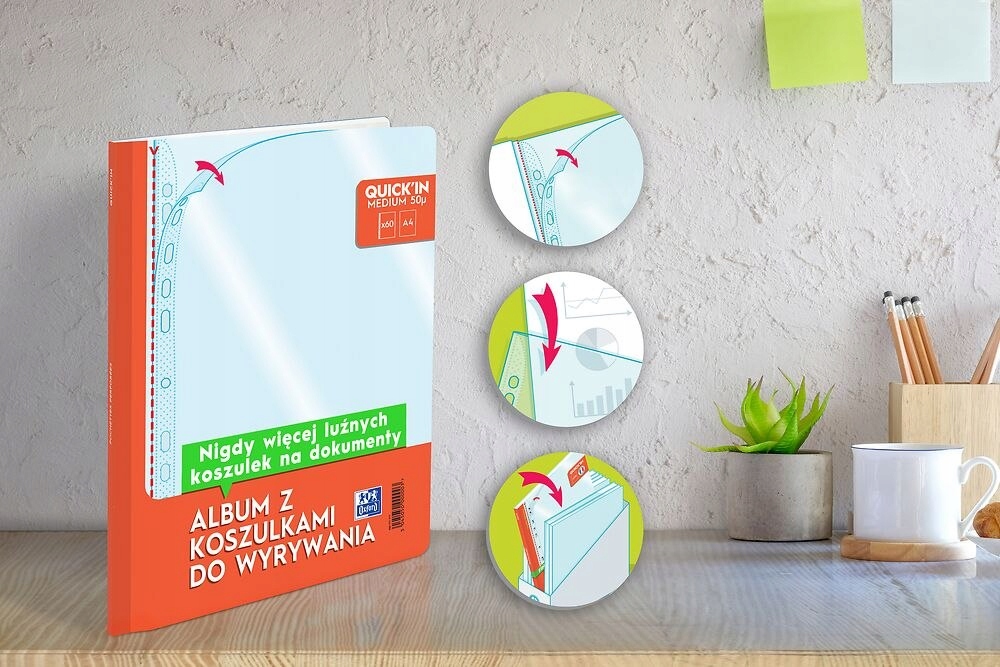 Izjemno praktičen album z odtrgalnim ovitki – zavzame toliko prostora kot zvezek A4. Mikroperforacija omogoča enostavno odtrganje ovitkov. Kristalni ovitki Quick'in ne zagotavljajo le odlične zaščite dokumentov in popolnoma jasne vidljivosti vsebine, temveč tudi udobje uporabe zaradi posebej profiliranega zgornjega kota, ki znatno olajša vstavljanje dokumentov. Ta inovativen, patentiran sistem odtrganja pomaga ohranjati ovitke organizirane in odpira nove možnosti uporabe. Lahko ga pospravite v stojalo za revije, skrijete v predal, postavite na polico in nosite v nahrbtniku ali torbi