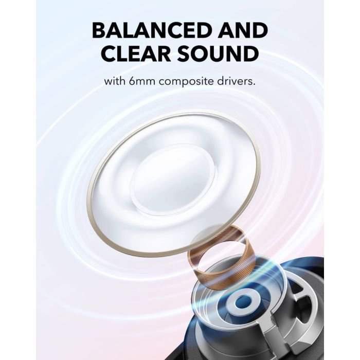 Soundcore A30i ima 6 mm kompozitne membrane, tako da lahko uživate v dobro uravnoteženem zvoku z bogatimi srednjimi, mogočnimi nizkimi toni in jasnimi visokimi toni.