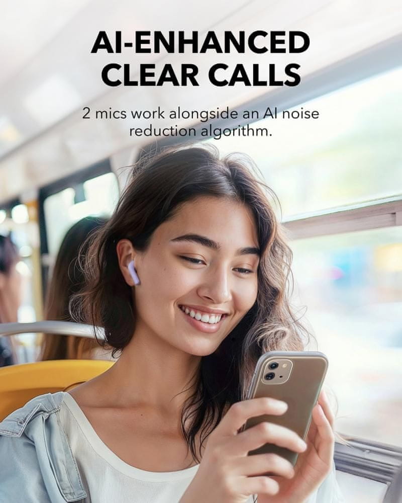 - Jasna kakovost klica: ušesne slušalke soundcore K20i imajo tehnologijo za zmanjševanje hrupa, ki jo poganja AI, ki natančno izolira vaš glas od hrupa v ozadju. Z dvojnim mikrofonom ENC ohranite prvotno jasnost klica tudi v živahnem okolju.