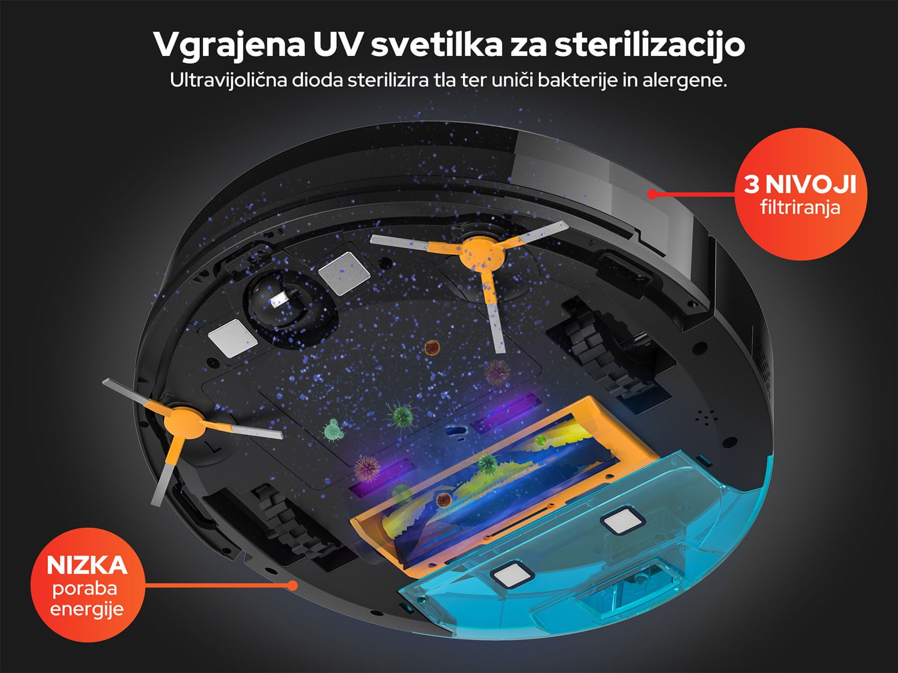| 3v1 čiščenje | DA (sesanje, pomivanje in UV dezinfekcija) |