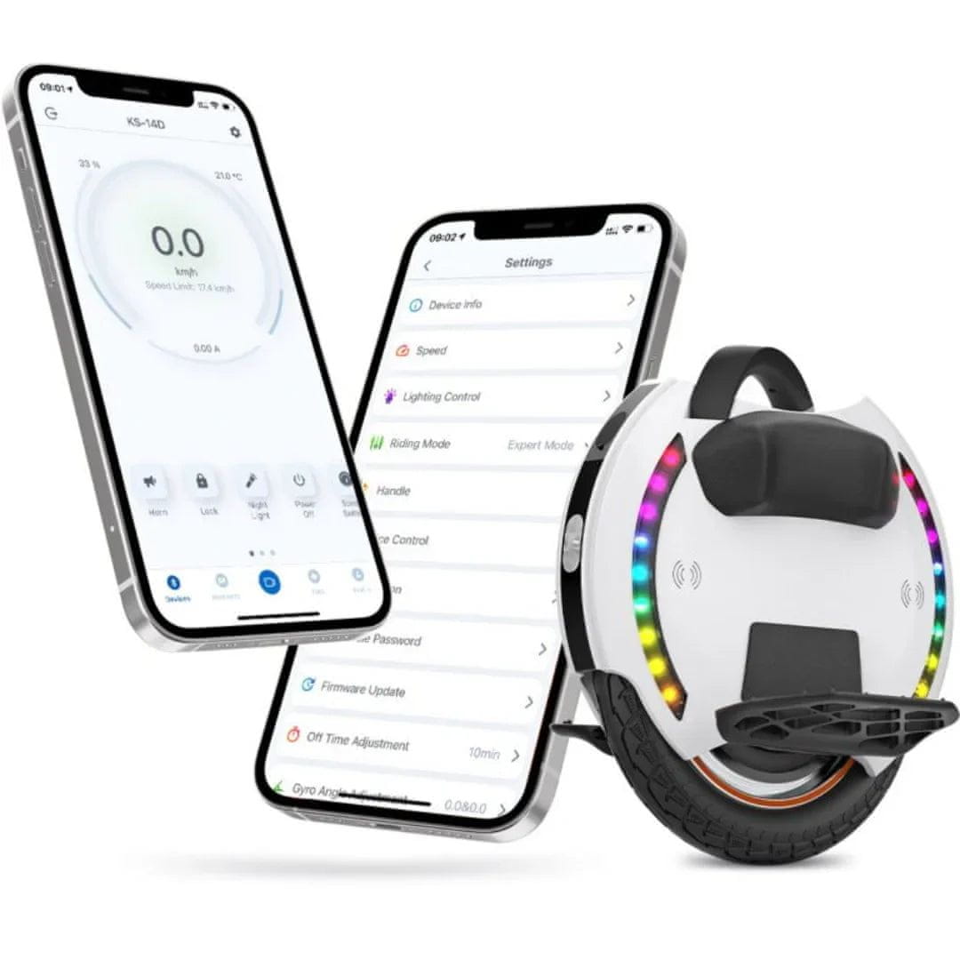 Povežite svoj monocikel z aplikacijo KingSong preko Bluetootha in odklenite celoten spekter pametnih funkcij. Aplikacija vam omogoča pregled nad podrobnimi informacijami, kot so stanje vozila, podatki o bateriji in prevoženi kilometri. Preko nje lahko enostavno upravljate luči, zaklenete motor, posodobite programsko opremo in še veliko več.