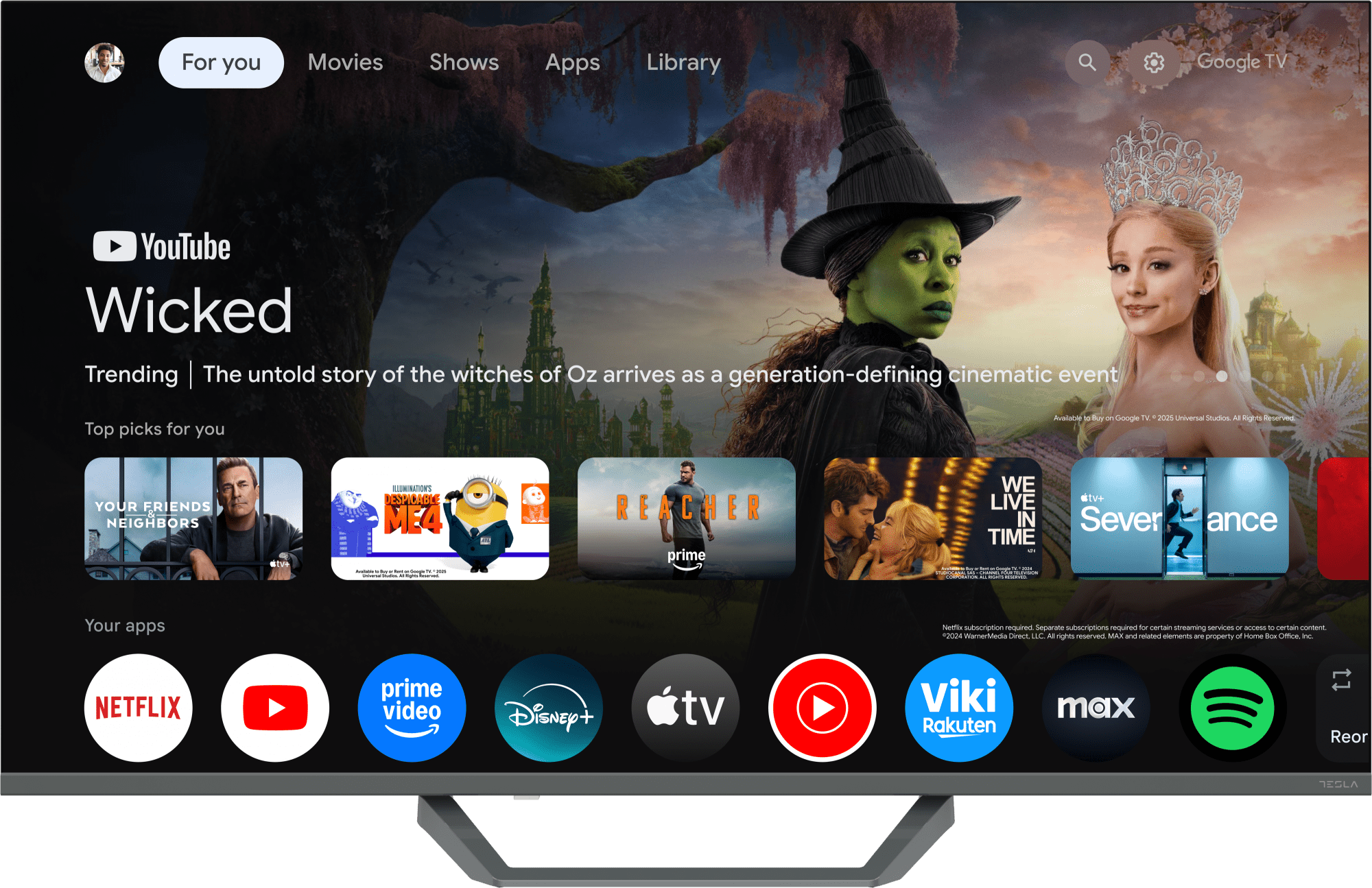 Google TV združuje priljubljene pretočne storitve, aplikacije in TV kanale v enoten in pregleden uporabniški vmesnik. Sistem omogoča dostop do aplikacij, kot so Netflix, YouTube, Disney+, Prime Video, MAX, Spotify, KODI in številnih drugih, ter ponuja personalizirana priporočila glede na navade uporabnika.