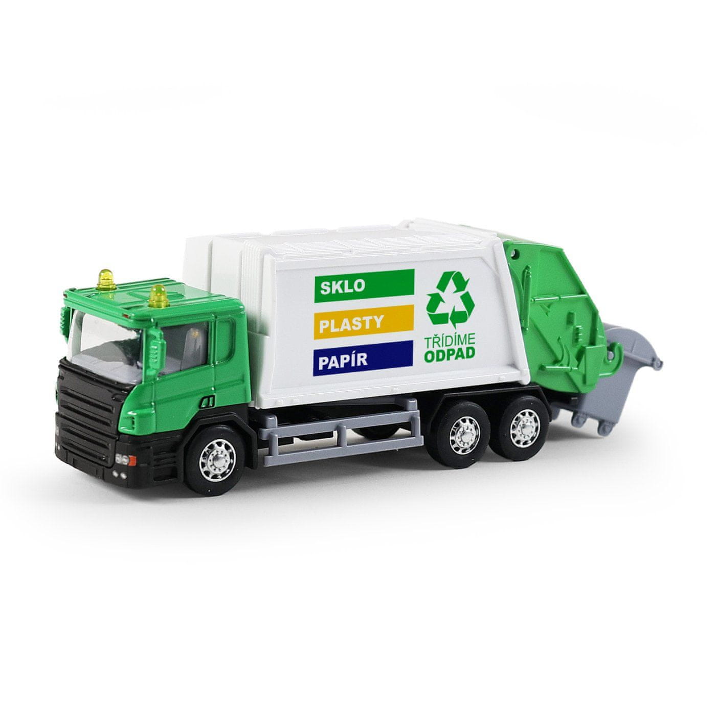 Kovinski tovornjak za smeti s plastično karoserijo. Karoserija ima zadaj vrata na tečajih, priložena je posoda za odpiranje. Vozilo vozi vzvratno, njegova dolžina pa je 15 cm.