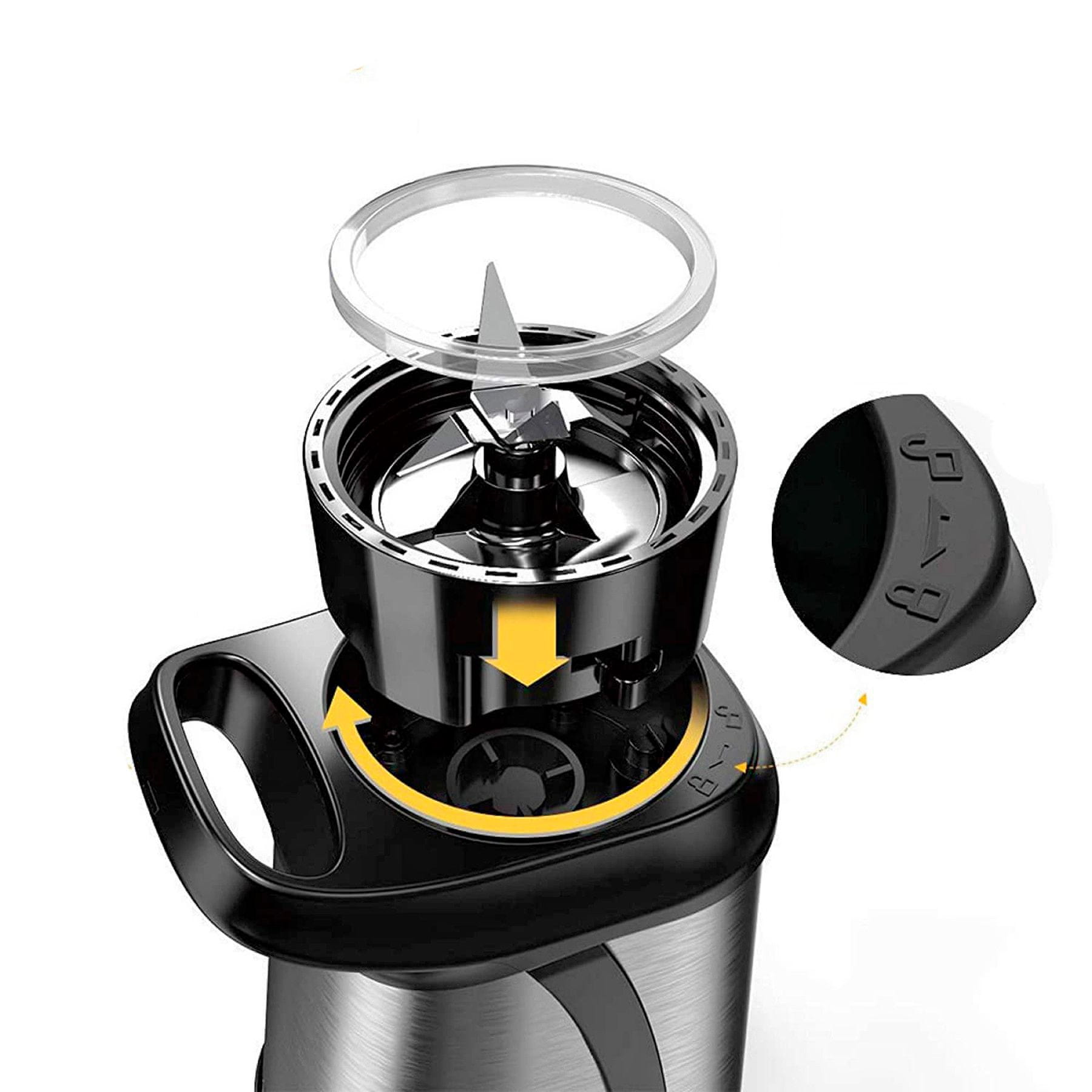 Komplet vključuje mešalnik iz nerjavečega jekla in 3 plastične posode brez BPA s prostornino 600 ml/600 ml/300 ml. Posode so izdelane iz visokokakovostne plastike, ki je varna za živila. Brez težav jih lahko operete v pomivalnem stroju ali jih operete ročno. Strast in posode za mešanje lahko priključite na osrednji motor, kar olajša pripravo različnih vrst smoothiejev.