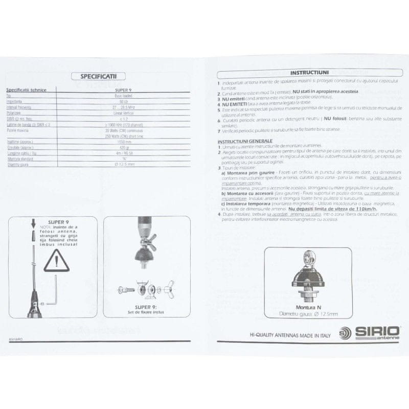 ZMOGLJIVOST: Največja uporabljena moč 250 WAntena Sirio SUPER 9 CB je znana po svojih zmogljivostih in tehničnih značilnostih, saj jo je mogoče kalibrirati na SWR manj kot 1,2. Dolžina antene 155 cm, vertikalna polarizacija in impedanca 50 Ohm zagotavljajo prijetno izkušnjo za vsakega uporabnika CB radijske postaje. Uporablja se lahko na frekvenčnem območju med 27 – 28,5 MHz, v ekstremnih vremenskih razmerah, odporna je na temperature med –26° in +60°, kar je posledica visokokakovostnih materialov, uporabljenih za njeno izdelavo. Antena Sirio SUPER 9 CB je izdelana z veliko prilagodljivostjo zaradi možnosti nagibanja s pomočjo metulja, pa tudi materiala: nerjaveče jeklo. Pozor, antene ne uporabljajte nagnjene za več kot 30°. Komunikacijska razdalja je še en odločilen dejavnik pri nakupu in uporabi CB antene. SUPER 9 ponuja možnost komunikacije do 20 km v idealnih delovnih pogojih: kalibrirana antena, odprto polje brez ovir, postaja z največjo zakonsko dovoljeno močjo in standardnim sprejemom. Vsaka ovira, kot so: hribi, gore, zgradbe, zidovi, lahko privede do zmanjšanja te razdalje.